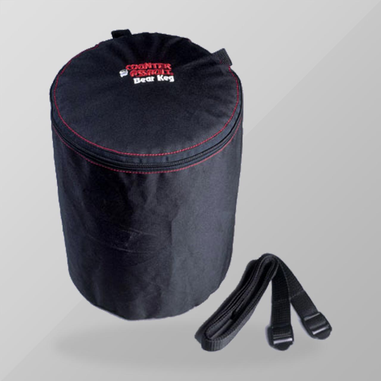 Gently used bear canister carry pack for a Counter Assault Bear Keg made of heavy duty black nylon with straps for attaching to backpack.